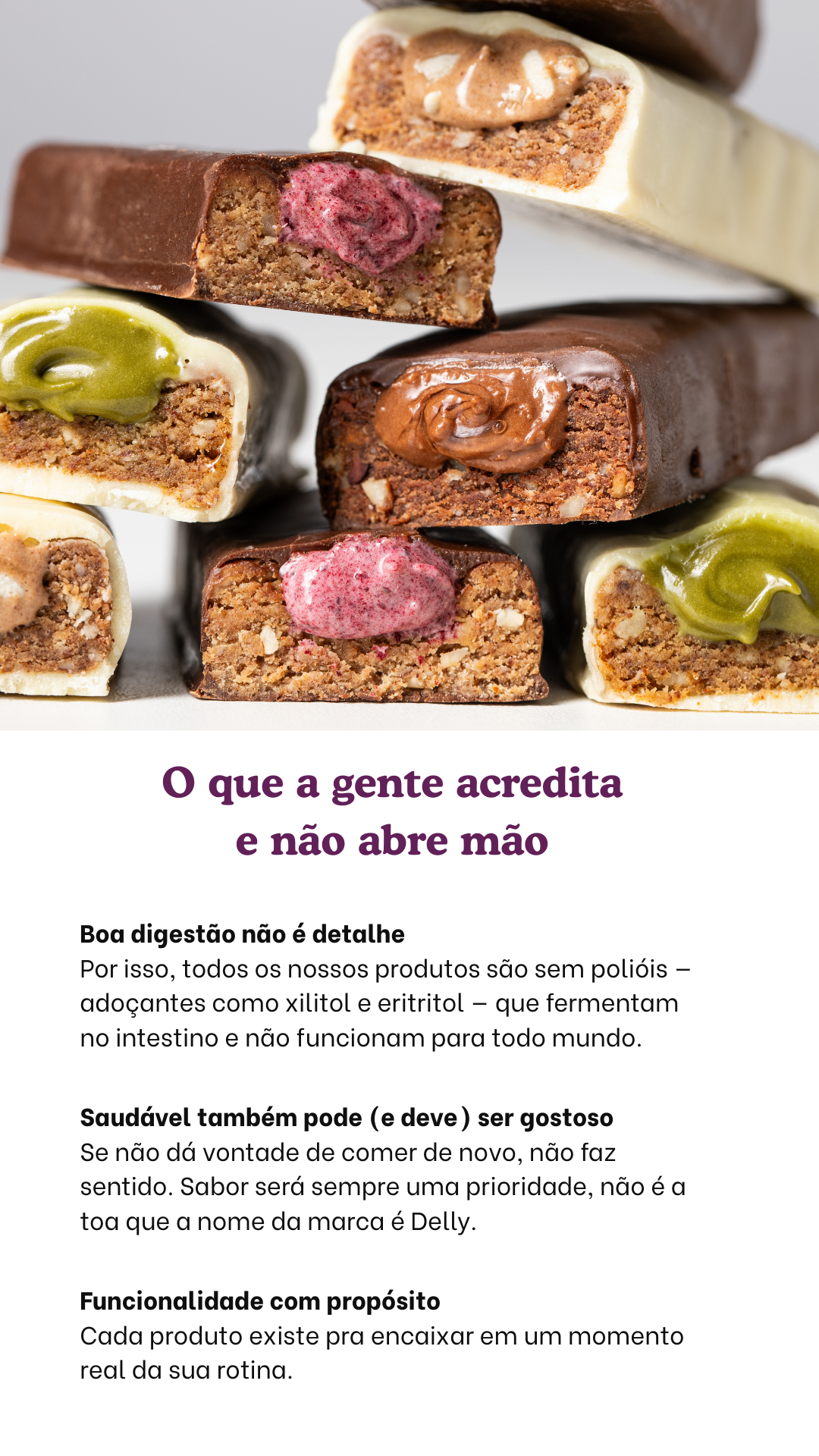 Desenvolvemos snacks saudáveis, com ingredientes que fazem sentido, pensados para diferentes momentos do seu dia. Práticos. Gostosos. E fáceis de manter na rotina.